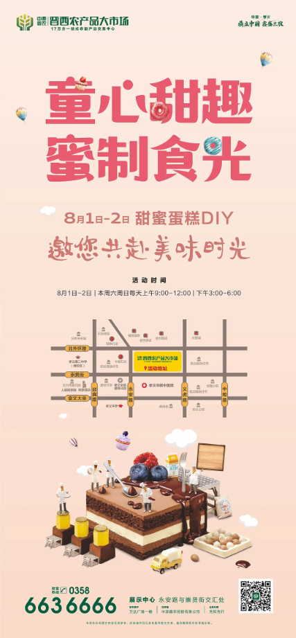 和孩子一起動手做蛋糕是件很幸福的事!加料、攪拌、塑型…不僅造型百變,好玩有趣,而且能培養寶寶的動手力、創造力和專注力,拉近與父母間距離...8 月1日-2 日每天上午 9:00-12:00,下午 3:00-6:00,晉西農產品大市場展示中心不見不散!
