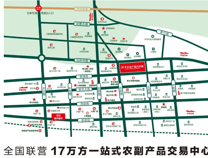 孝義農產品大市場位于城市主干道永安路與崇賢街交匯處,項目總投資10億元,占地面積約220畝,總建筑面積約17萬㎡,涵蓋了農產品交易區、農特優展銷區、商務辦公區、倉儲加工區、冷鏈物流區、配套服務區六大功能區。項目建成后,將成為集農產品展覽交易、電子商務、電子結算、加工配送、凈菜加工、冷鏈物流、質量檢測、信息發布、創業孵化、金融服務、休閑娛樂等功能為一體的現代化大型綜合服務平臺。